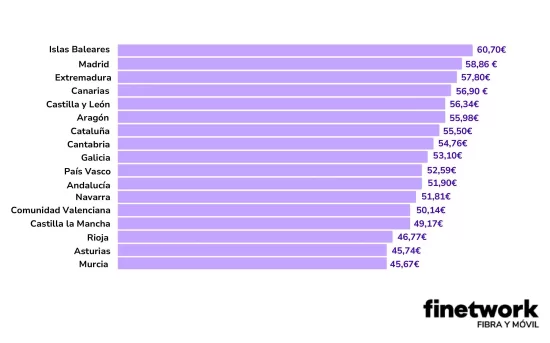 Finetwork, compañía española de fibra y móvil, ha compartido los resultados de un estudio que revela lo que pagan los ciudadanos españoles en su tarifa de Internet fijo y móvil. Así, de media, los españoles pagan 54 euros al mes por estos paquetes de conectividad. Por comunidades autónomas, los ciudadanos de baleares lideran este listado, declarando un gasto medio de 60,70 € al mes, seguidos por los madrileños (58,86 euros) y los extremeños (57,80 euros). En el extremo opuesto, los murcianos serían los que menos pagan por sus servicios de fibra y móvil, con una media de 45,67 euros, más de 15 euros por debajo del primer puesto y 8 euros menos que la media nacional.