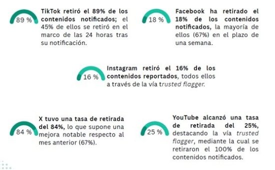 El boletín de Oberaxe refleja que el 89% de contenido racista y xenófobo retirado por TikTok es la tasa más alta de retirada de contenido, frente a Instagram donde solo el 16% de los contenidos acabaron siendo eliminados. Por su parte, Facebook lo hizo con el 18% de los mensajes que le fueron reportados, YouTube con el 25% y X retiró el 84% de los contenidos notificados, frente al 67% en diciembre.