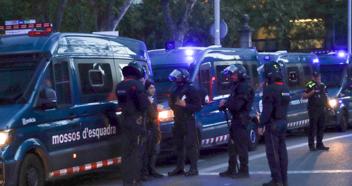 Los Mossos d’Esquadra vigilan la plaza Bonanova de Barcelona ante el aviso de protestas este jueves por la tarde contra la ocupación de los edificios La Ruïna y el Kubo.