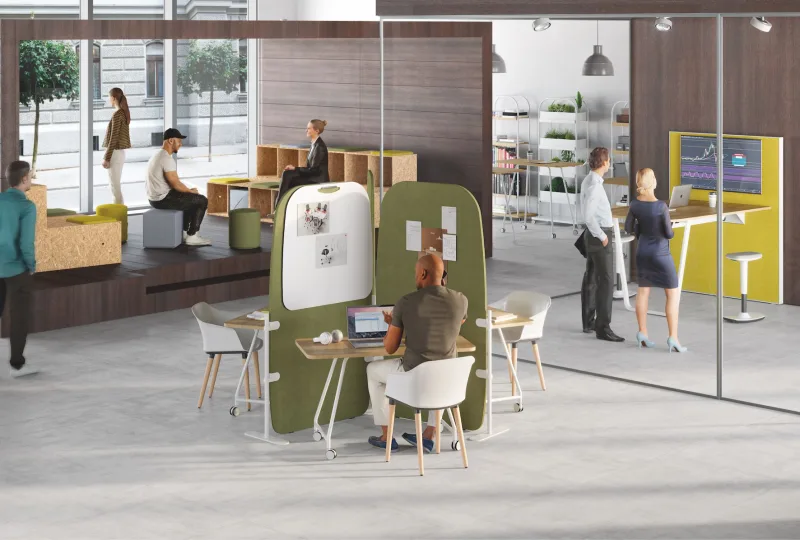Las distracciones y el ruido en un open space -incrementado con las constantes reuniones online y video llamadas- amenazan el diseño de oficinas eficaz. Para atraer a las personas, las oficinas deben proporcionar espacios privados donde las personas puedan unirse a reuniones virtuales, atender llamadas telefónicas y trabajar juntas en persona sin molestar a quienes las rodean.