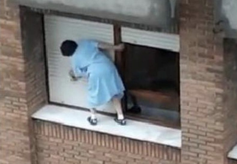 Una mujer ha sido grabada limpiando las persianas de su casa en el sétimo piso de un edificioen Gijón sin utilizar ninguna protección para ello.