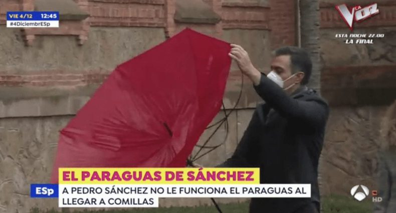 Las fuertes rachas de viento le jugaron una mala pasada y provocaron que su paraguas se diera la vuelta quedando inservible. Un escolta del mandatario no tardó en acudir en su ayuda para proporcionarle uno nuevo que le protegiera de la lluvia.