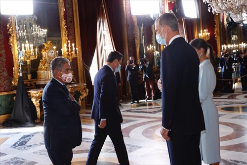 El Palacio Real de Madrid ha vuelto a acoger este martes como marca la tradición por la Fiesta Nacional la recepción por parte de los Reyes a las principales autoridades y representantes de la sociedad española, aunque con un número inferior de invitados, algo menos 200, sin bebida y con la mascarilla obligatoria para cumplir con las normas vigentes.