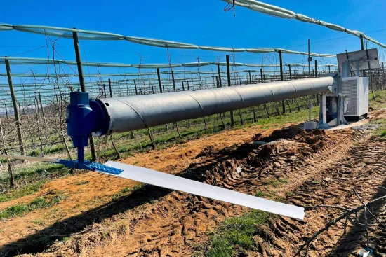 El mecanismo de protección se basa en la explotación de la inversión térmica, un fenómeno natural que ocurre durante las noches heladas. Aprovechando el aire caliente atrapado en las capas superiores, el sistema lo canaliza hacia las plantaciones, elevando sus temperaturas y evitando así los efectos destructivos de las heladas. Este intercambio térmico, junto con la energía cinética generada por el constante movimiento del aire sobre los cultivos, constituye la clave para prevenir los daños.