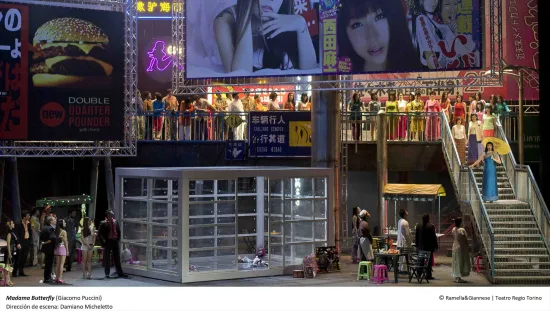 Tal y como habían alertado en la previa, esta nueva versión huye de todos los detalles que asocian a esta ópera con el orientalismo, salvo un escenario que no deja de recordar a las metrópolis actuales con carteles de anuncios y escaleras infinitas hacia recovecos con comercios dentro de una plaza cerrada.