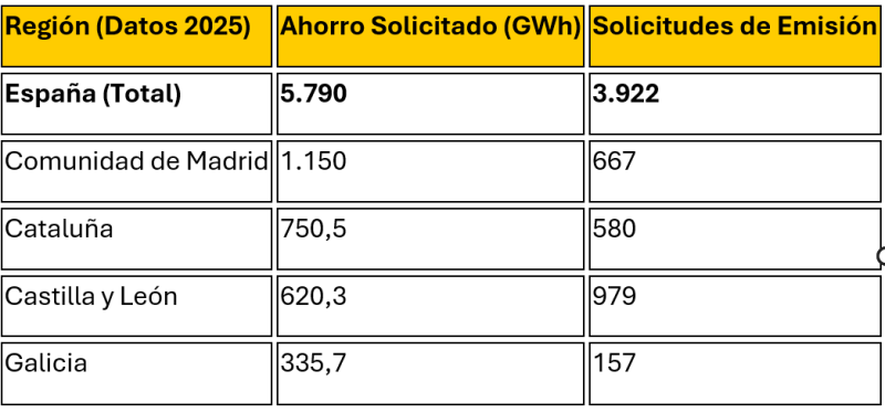 El informe de cierre de ejercicio del MITECO revela una clara hegemonía de los grandes núcleos económicos. La Comunidad de Madrid lidera el país con 1.150 GWh solicitados en 2025 (frente a los 602,4 GWh de 2024). Le sigue Cataluña, que ha pasado de los 228,3 GWh de 2024 a 750,5 GWh en 2025, y Castilla y León, que destaca por su capilaridad con 979 solicitudes y un ahorro de 620,3 GWh. Por su parte, Galicia registra 335,7 GWh, consolidando proyectos clave en su tejido productivo.