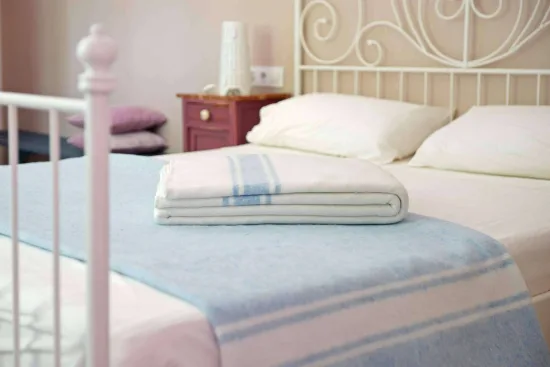 La cama quedaría vestida con unas sábanas y encima la manta de algodón. Como su diseño es clásico, no haría falta nada más encima, con tan solo una colcha a juego el dormitorio se vería impecable. Además, el color de las mantas permite que se puedan combinar perfectamente con la decoración de la cama, ya que el blanco y el azul son dos colores que se complementan perfectamente dando luminosidad a la estancia.