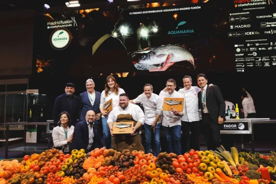 Gustavo Larrazábal, presidente de Aquanaria, empresa que patrocina este premio, le entregaba a la chef el merecido trofeo como Premio Sostenibilidad Aquanaria Madrid Fusión Alimentos de España 2024 a María José Martínez, por la contribución en la difusión, estudio y protección de la polinización de las abejas, y de los productos ecológicos de su territorio en la Comunidad Valenciana.