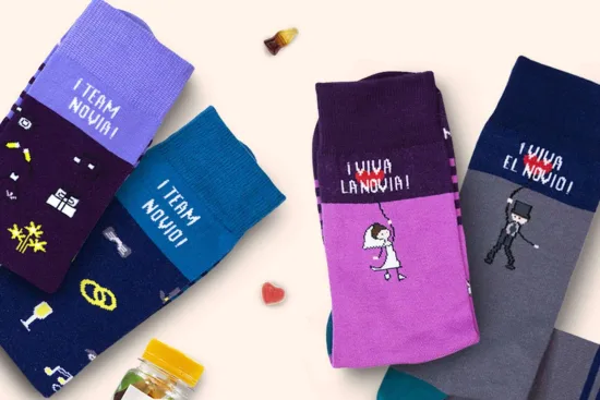 Dentro de su catálogo de productos tienen calcetines con frases «Viva el Novio» y «Viva la Novia» y packs con cajas personalizas que incluyen calcetines y un pildorero «Y vivieron felices y comieron gominolas», excelente para endulzar el paladar de los futuros esposos.