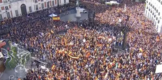 Miles de personas se concentran este domingo en la Puerta del Sol de Madrid en la movilización convocada por el Partido Popular contra la «sesión absoluta» del presidente del Gobierno en funciones, Pedro Sánchez, a los independentistas tras el acuerdo entre el PSOE y Junts que incluye la amnistía.