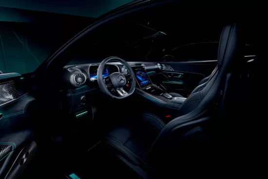 El interior también se caracteriza por numerosos detalles en color PETRONAS. Los asientos AMG Performance de serie están tapizados en cuero napa negro/Microfibra MICROCUT con pespuntes en color PETRONAS y escudos AMG en relieve en los reposacabezas. Las inserciones AMG de carbono combinan con el volante calefactado AMG Performance de cuero MICROCUT/microfibra con pespuntes en color PETRONAS. Este pespunte también se encuentra en los guarnecidos de las puertas, el cuadro de instrumentos y la consola central. Los embellecedores AMG de los umbrales de las puertas están revestidos de negro e iluminados en color PETRONAS.