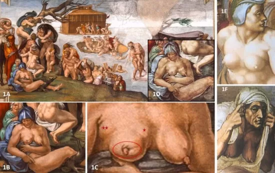 En el estudio, «¿Pintó Miguel Ángel a una mujer adulta joven con cáncer de mama en ‘El diluvio’ (Capilla Sixtina, Roma)?», publicado en The Breast, expertos de Alemania, Italia, Francia, Austria y el Reino Unido que abarcan campos como la historia del arte, la medicina, la genética y la patología, se centraron en una figura femenina específica en el lado derecho de «El diluvio», utilizando las pautas para el iconodiagnóstico.