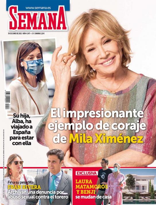 La revista Semana resalta el coraje de Mila Ximénez y pone a la colaborado como ejemplo en estos momentos tan duros por los que atraviesa. Su hija Alba ha regresado a España desde Amsterdam para estar con ella. El torero Fran Rivera respira tranquilo: se archiva la denuncia contra el diestro por un presunto abuso sexual. Para finalizar, la mudanza de Laura Matamoros y su novio Benji.
