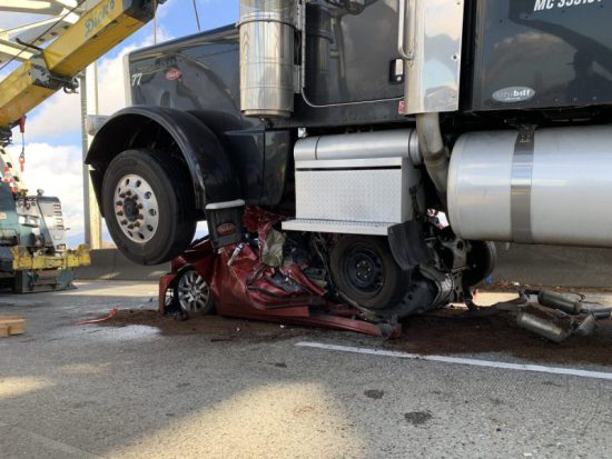 There’s really not a word to describe this collision. Miraculously believed to be minor injuries. The car was struck from behind, folded the car in half, and semi came to rest on top of the car. In my 14 year career, I have never seen anything like it. https://t.co/iUsSNIhHYV pic.twitter.com/EPGI70s3Um