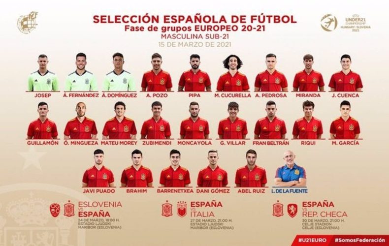 DEFENSAS: Alejandro Pozo (Eibar), Gonzalo Ávila ‘Pipa’ (Huddersfield), Marc Cucurella (Getafe), Adriá Pedrosa (Espanyol), Juan Miranda (Betis), Jorge Cuenca (Almería), Hugo Guillamón (Valencia) y Óscar Mingueza (Barcelona) y Mateu Morey (Borussia Dortmund).