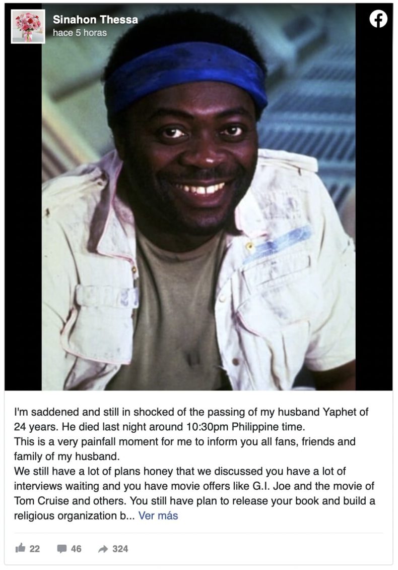 El actor estadounidense Yaphet Kotto falleció el domingo en Filipinas a los 81 años de edad, tal y como anunció su esposa en su cuenta de Facebook.