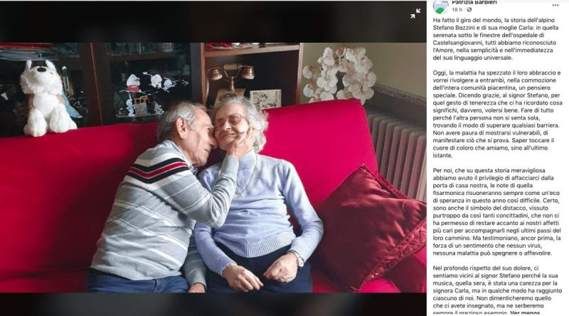 «Para nosotros, que hemos tenido el privilegio de mirar por la puerta de nuestra casa esta maravillosa historia, las notas de ese acordeón siempre resonarán como un eco de esperanza en este difícil año. Por supuesto, son también el símbolo del desapego, desgraciadamente experimentado por tantos conciudadanos, que no nos ha permitido permanecer cerca de nuestros más queridos para acompañarlos en los últimos pasos de su viaje. Pero atestiguan, incluso antes de eso, la fuerza de un sentimiento de que ningún virus, ninguna enfermedad puede extinguirse o debilitarse. Con profundo respeto por su dolor, nos sentimos cerca del Sr. Stefano porque su música, esa noche, fue una caricia para la Sra. Carla, pero de alguna manera llegó a cada uno de nosotros. No olvidaremos lo que nos has enseñado, pero siempre te serviremos como un precioso ejemplo», ha concluido junto con una fotografía del matrimonio.