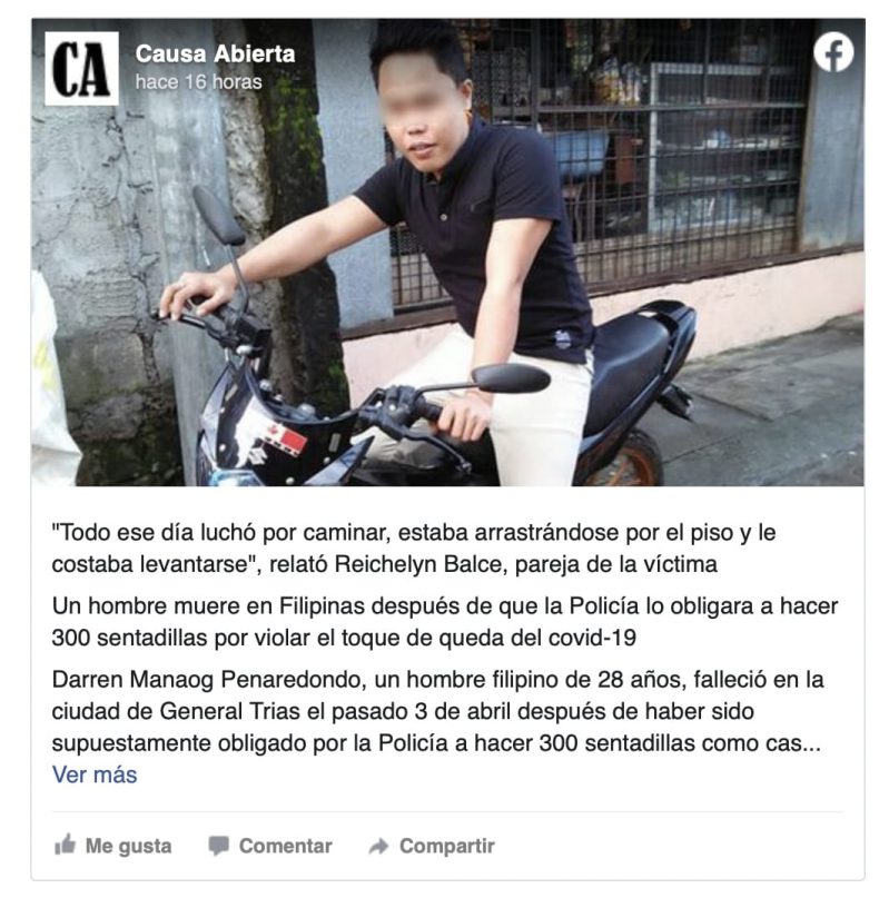 El hombre, de 28 años e identificado como Darren Manaog Penaredondo, murió el pasado 3 de abril en la ciudad de General Trias tras saltarse el toque de queda y ser sido sorprendido por un policía, el cual le obligó a hacer 300 sentadillas, informa ‘Rappler’.