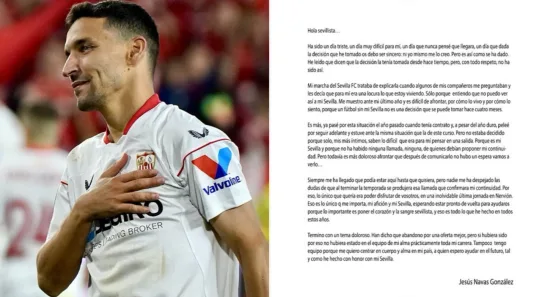 Además, el internacional español se mostró al servicio de Luis de la Fuente para la Eurocopa de este verano. «Tampoco tengo equipo porque me quiero centrar en cuerpo y alma en mi país, a quien espero ayudar en el futuro, tal y como he hecho con honor con mi Sevilla», termina la carta de un Navas que tiene aún dos partidos de Liga, el último en una semana contra el FC Barcelona en el Sánchez-Pizjuán.