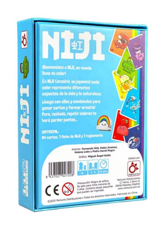 Niji es un juego de cartas, de estética colorida y ambientación japonesa que lanzó Mercurio, el pasado 25 de abril de 2025. Se trata de un juego pensado para 2 a 6 jugadores, con partidas rápidas de 15 minutos, y público objetivo mayor de 6 años.