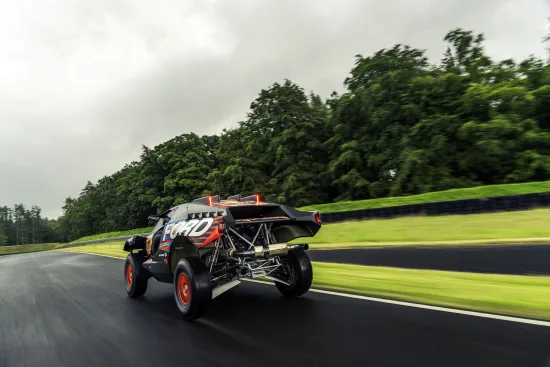 Diseño todoterreno a medida: El vehículo, compuesto por un bastidor espacial de acero T45 y paneles de carrocería de fibra de carbono, combina funcionalidad con la estética característica del Ford Raptor, como una altura libre al suelo de 400 mm, una postura amplia para mejorar la estabilidad todoterreno y una parrilla cincelada con la inscripción FORD en la parte delantera, lo que ofrece tanto un aspecto llamativo como ventajas de rendimiento. El Ford Raptor T1+ tiene un peso mínimo de 2.010 kg, una anchura de 2.300 mm y un ángulo de aproximación de más de 70°.