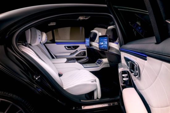 Experiencia ejecutiva de primera clase con asientos traseros de primera clase, entretenimiento trasero de alta gama MBUX con dos pantallas de 13’1 pulgadas, dos mandos a distancia MBUX desmontables y videoconferencia integrada transforman la cabina trasera en un lugar de trabajo totalmente conectado o en un tranquilo refugio personal.