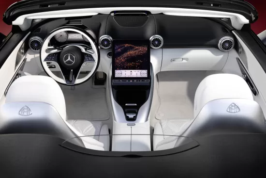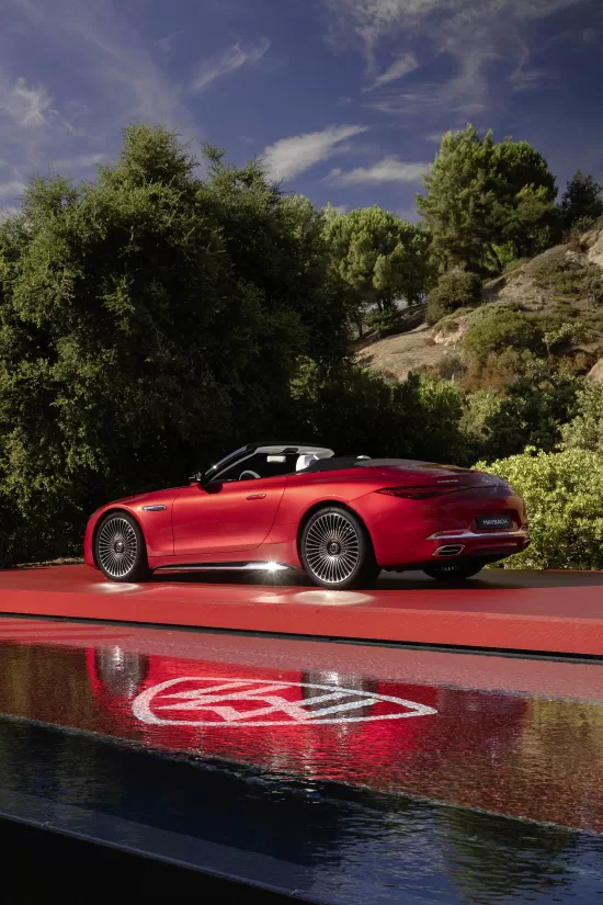 La capota cuenta con un gran aislamiento acústico y está fabricada en tejido negro claro, con el logotipo de Maybach sutilmente incorporado en antracita. La zaga se caracteriza por unos pilotos traseros con el emblema Maybach, un paragolpes trasero específico de la marca con detalles en acabado cromado, un difusor de diseño específico y embellecedores para las salidas de escape con una característica barra horizontal. Detrás de los asientos, una doble toma de aire de diseño aerodinámico refuerza el aspecto único del coche. Junto con la aleta cromada del capó, confiere al biplaza unas proporciones especialmente elegantes y deportivas cuando se mira desde el lateral, especialmente cuando la capota está bajada.