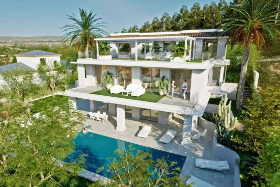 Esta área, además, dispone de dos dormitorios y de una biblioteca con vistas al jardín y piscina. Finalmente, la primera planta cuenta con tres dormitorios adicionales, vestidor y una extensa terraza que aporta una apariencia lujosa, clásica y moderna a la villa completa.