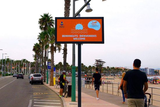 Entre las soluciones más habituales se encuentran los mupis LED y los tótems digitales, empleados para información ciudadana y señalización institucional; los paneles y monopostes informativos ubicados en espacios urbanos estratégicos; así como las pantallas LED instaladas en oficinas de turismo, donde refuerzan la promoción cultural y patrimonial. En instalaciones cerradas, como auditorios municipales o pabellones deportivos, se incorporan videomarcadores y pantallas de gran formato que mejoran la experiencia en eventos culturales, deportivos y actos públicos.