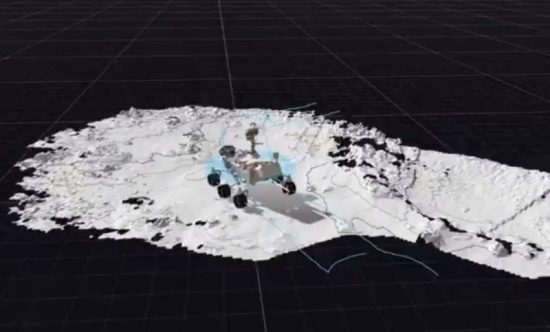 Se ve al rover moviéndose en la superficie del planeta rojo mientras el área cercana se ilumina en color blanco mientras se forman líneas que muestran la posición de las ruedas.