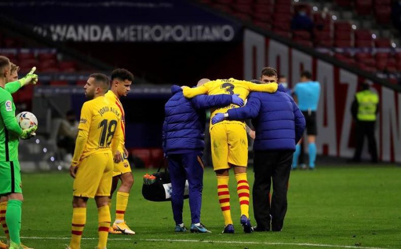 El central del FC Barcelona Gerard Piqué tiene «un esguince en la rodilla derecha», según las primeras pruebas realizadas al jugador, que se tuvo que retirar lesionado este sábado en la derrota de su equipo (1-0) ante el Atlético de Madrid.