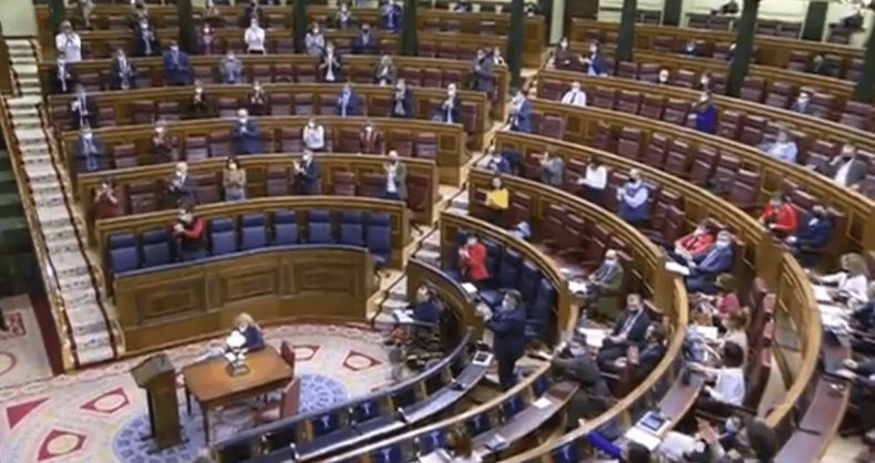 En el lado derecho del hemiciclo y en la parte del sector central que ocupa Vox, respondían al júbilo de socialistas y ‘morados’ puestos en pie y dando gritos de ‘libertad, libertad’. La mayoría de estos diputados, especialmente los del PP, acompañaban sus gritos de golpes en los escaños.