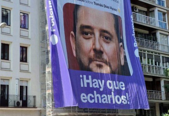 Le acompaña una gran foto de Tomás Díaz Ayuso con la frase ‘Hay que echarlos!. La imagen de la lona ha sido tuiteada esta mañana por el exlíder de Podemos, Pablo Iglesias, con la frase «Nos mandan esto que ha aparecido en la calle Goya de Madrid».