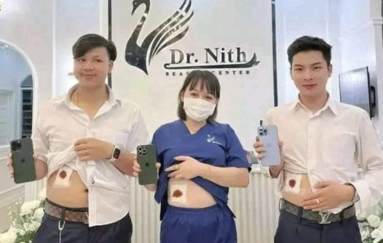 La imagen muestra a tres pacientes del Dr. Nith Beauty Center con una venda con sangre en la zona de su riñón derecho. Todos ellos sonríen a la cámara posando con un iPhone en las manos.