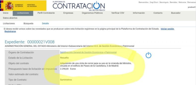 El ministro del Interior, Fernando Grande-Marlaska, disfruta en su piso de La Castellana de Madrid de una cinta de correr de 2.770,90 euros pagada con los fondos del Ministerio, tal y como detalla un anuncio de adjudicación publicado en la Plataforma de Contratación del Sector Público y recogido por ‘El Independiente’.
