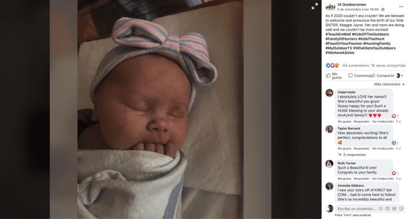 “¡Como si el 2020 no pudiera ser más loco! Estamos bendecidos de recibir y anunciar el nacimiento de nuestra hermanita”, anunció la familia en su página en Facebook ’14 Outdoorsmen’.
