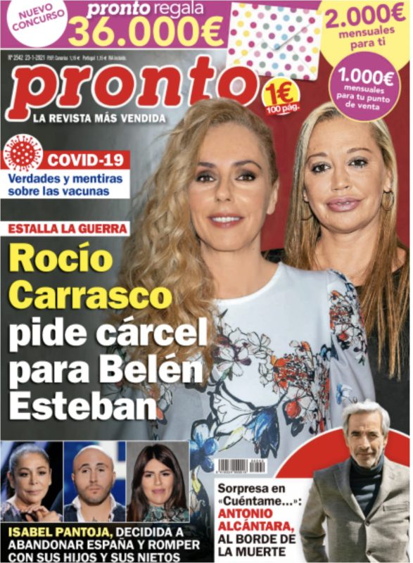 Esta semana en Pronto, Rocío Carrasco pide cárcel para Belén Esteban. Estalla la guerra entre la hija de Rocío Jurado y la colaboradora televisiva. Isabel Pantoja, decidida a abandonar España y romper con sus hijos y sus nietos. Antonio Alcántara (‘Cuéntame’), al borde de la muerte…