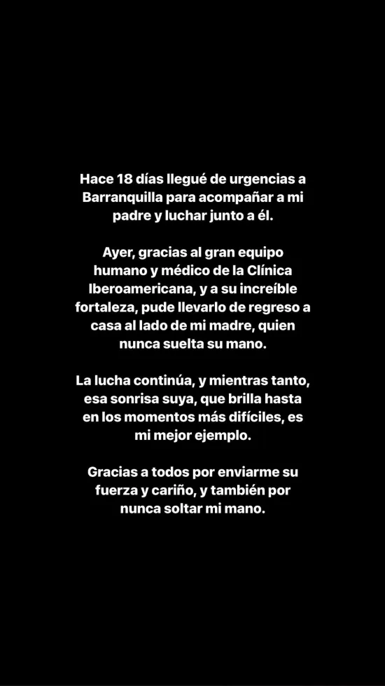 En esta ocasión ha sido la propia cantante la encargada de comunicar la noticia a través de su cuenta de Instagram, escenario que ha utilizado como altavoz para agradecele a los sanitarios el gran trabajo que han hecho por con su padre. «Hace 18 días llegué de urgencias a Barranquillas para acompañar a mi padre y luchar junto a él. Ayer, gracias al gran equipo humano y médico de la Clíica Iberoamérica y a su increíble fortaleza, pude llevarlo de regreso a casa al lado de mi madre, quien nunca suelta su mano» relata la cantante en una de sus historias de Instagram como muestra de agradecimiento a todo el equipo médico que le ha acompañado en estos días.