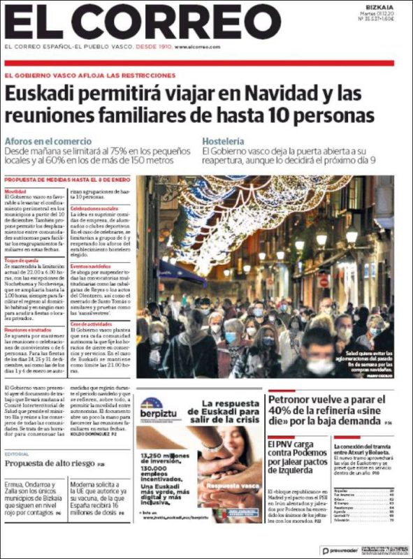 «Euskadi permitirá viajar en Navidad y las reuniones familiares de hasta 10 personas»; «Petronor vuelve a parar el 40% de la refinería «sine die» por la baja demanda»; «El PNV carga contra Podemos por jalear pactos de izquierda»; «La conexión del tranvía