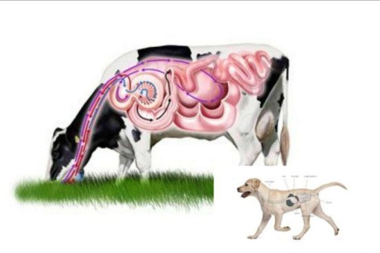 Puede parecer extraño, pero si se observa el aparato digestivo canino, desde la boca, cuya función es solamente cortar y tragar, hasta su limitado estómago y reducido sistema de glándulas, necesita que alguien acondicione los alimentos antes de consumirlos. Entonces, ¿Quién procesa los alimentos que comen los perros? Las presas. Son ellas las que tiene una boca con movimiento lateral y muelas con meseta para formar bolo alimenticio. Tienen cuatro estómagos para distintos procesos de los nutrientes. Pueden cortar con la amilasa y otras enzimas las cadenas largas de polisacáridos y convertirlas en azúcares simples. Es por eso que para todos los que piensan que los perros comen comida natural como carne, huesos y verduras cortadas y ralladas, pueden resultar sorprendentes varios aspectos. Para empezar, las verduras que su dueño corta y ralla con tanto trabajo, irán a las deposiciones sin poder asimilarse. Además, la carne podrá ser asimilada, pero no tiene todo lo que el perro necesita, por lo que es normal verle comer desesperado los excrementos de caballos o vacas cuando se pasea por el campo, es decir que el perro está buscando allí, en esos excrementos, los nutrientes que la presa hubiera procesado con su aparato digestivo. Por último, los huesos desgastarán o incluso romperán prematuramente los dientes, y además podrán acumularse en su aparato digestivo hasta causar graves lesiones o incluso la muerte.