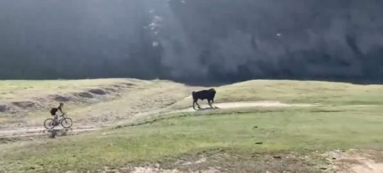 Este ciclista ve que hay un inmenso toro en medio de la vía, pero aún así le da de terco 🤦🤦🤦 pic.twitter.com/SjAqC8QXsu