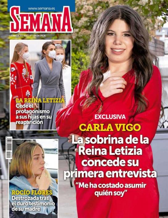 Carla Vigo, hija de Erika, la hermana fallecida de la reina Letizia, concede su primera entrevista a un medio. “Me ha costado asumir quién soy”, asegura la joven. La princesa Leonor gana protagonismo y Rocío Flores destrozada tras el duro testimonio de su madre Rocío Carrasco en Telecinco son los temas que aborda la revista Semana en su portada.