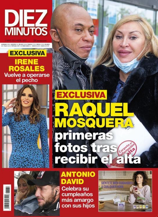 Diez minutos concede la parte principal de su primera página a Raquel Mosquera. La peluquera se recupera al lado de su pareja tras recibir el alta por un nuevo brote psicótico. Exclusiva: la mujer de Quico Rivera, Irene Rosales, se ha puesto pechos nuevos. Antonio David celebra su cumpleaños en compañía de sus hijos en medio del huracán mediático.