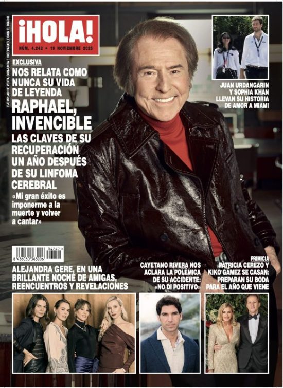 ¡Hola! ofrece una entrevista a Raphael un año después de serle detectado un linfoma cerebral: “Mi gran éxito es imponerme a la muerte y volver a cantar”. Juan Urdangarin y Sophia Khan llevan su historia de amor a Miami y Patricia Cerezo y Kiko Gámez se casarán el año que viene tras cuatro años de noviazgo. Alejandra Gere disfruta de una noche con amigas mientras que Cayetano Rivera habla para la revista asegurando que no dio positivo en el control policial tras estrellar su furgoneta.