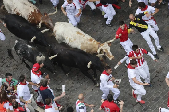 Los toros de la ganadería madrileña han entrado en la calle Estafeta sin caer en la curva, con un cabestro a la cabeza y así han continuado por este tramo, donde el grupo se ha ido estirando hasta dividirse en dos grupos, con tres toros un poco más retrasados. Esto ha permitido a los corredores hacer largas y vistosas carreras junto a los astados.