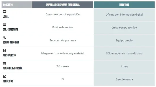 3.- La estructura es eficiente, no cuentan con grandes locales, exposición, ni equipo comercial. Son digitales, las exposiciones son las de sus proveedores a los que el cliente compra a precio profesional, y el presupuesto lo realiza el mismo director técnico que después coordina la reforma.