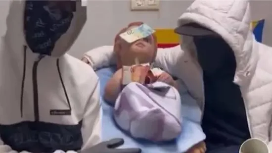 Entre ambos, y sobre una cama en la que están sentados, se encuentra la figura del niño Jesús con varios billetes de 10 y 20 euros a su alrededor.