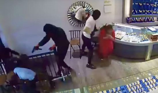 Los hechos se denunciaron el pasado viernes epoco antes del cierre del establecimiento. Las Imágenes de cámaras de seguridad muestran el momento en que los ocho intrusos armados, con vestimenta y capucha oscuras, ingresan en Virani Jewelers, en Iselin.