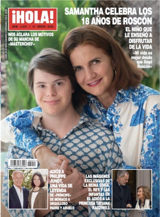 ¡Hola! presenta a Roscón, hijo de Samantha Vallejo-Nágera, que cumple 18 años. La cocinera explica por qué deja MasterChef y del chico, que nació con síndrome de Down, dice que su vida es mejor desde que llegó. Vemos en portada el adiós a Philippe Junot y al rey Felipe VI con doña Sofía en la despedida a la princesa Tatiana Radziwill.