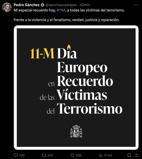 Así lo ha trasladado a través de un mensaje en la red social ‘X’. «Mi especial recuerdo hoy, 11M, a todas las víctimas del terrorismo. Frente a la violencia y el fanatismo, verdad, justicia y reparación», ha señalado el jefe del Ejecutivo en el Día Europeo de las Víctimas del Terrorismo.